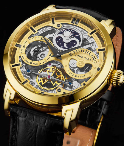 This is one outstanding watch. Easy to set up the dual time zone. Percent size and not heavy. It has easy to read hands. The 24 mm band is the right size and is soft leather. Keeps perfect time. This is my 4th Stuhrling and my second dual time Stuhrling skeleton watch.