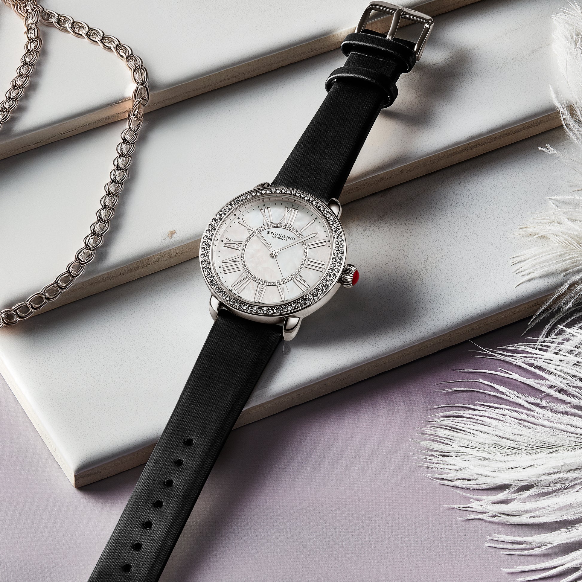 Each timepiece features a genuine mother-of-pearl dial framed by a halo of crystals, capturing light with every movement. The slim 40mm case, Roman numeral dial, and Satin Covered leather strap blend classic elegance with modern versatility, creating a watch that shines as brightly as the woman who wears it.