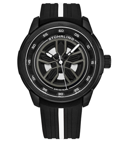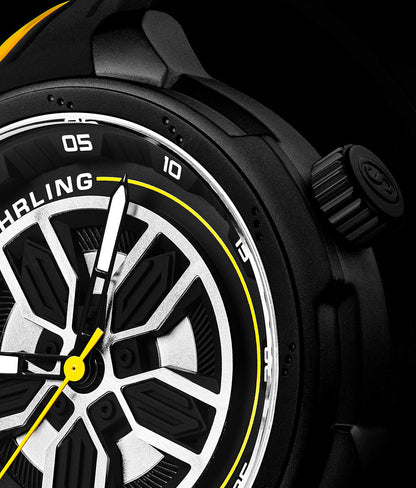 This 44mm watch strikes an assertive profile with its unique design inspired by automotive excellence. The fixed bezel is decorated with a brake rotor motif that speaks to the spirit of speed and precision. It's paired with a 22mm wide rubber strap, distinguished by a color stripe that adds a dynamic visual element while ensuring comfort and resilience on the wrist.