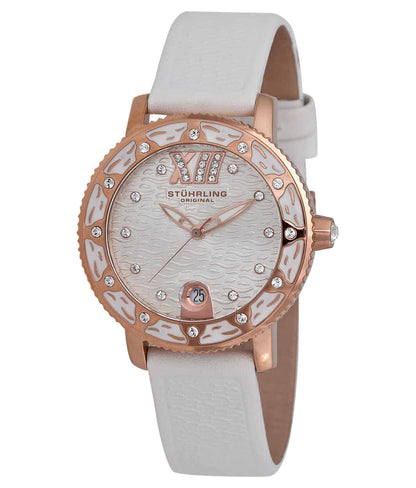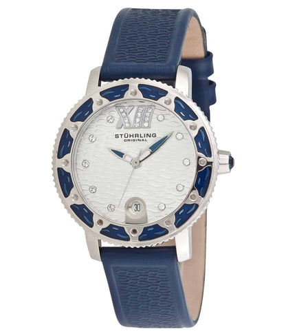 - Coin Edge Bezel with Enamel Fill Creating Wave Design Between the Chapters; Swarovski Crystal Markers at All Twelve Hour Positions on Bezel.