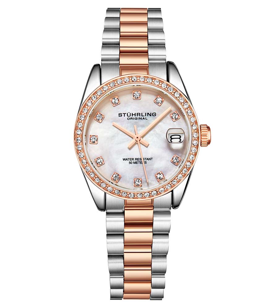 - Une lunette sertie de pierres précieuses encadre parfaitement les aiguilles de style obélisque et les marqueurs en cristal.