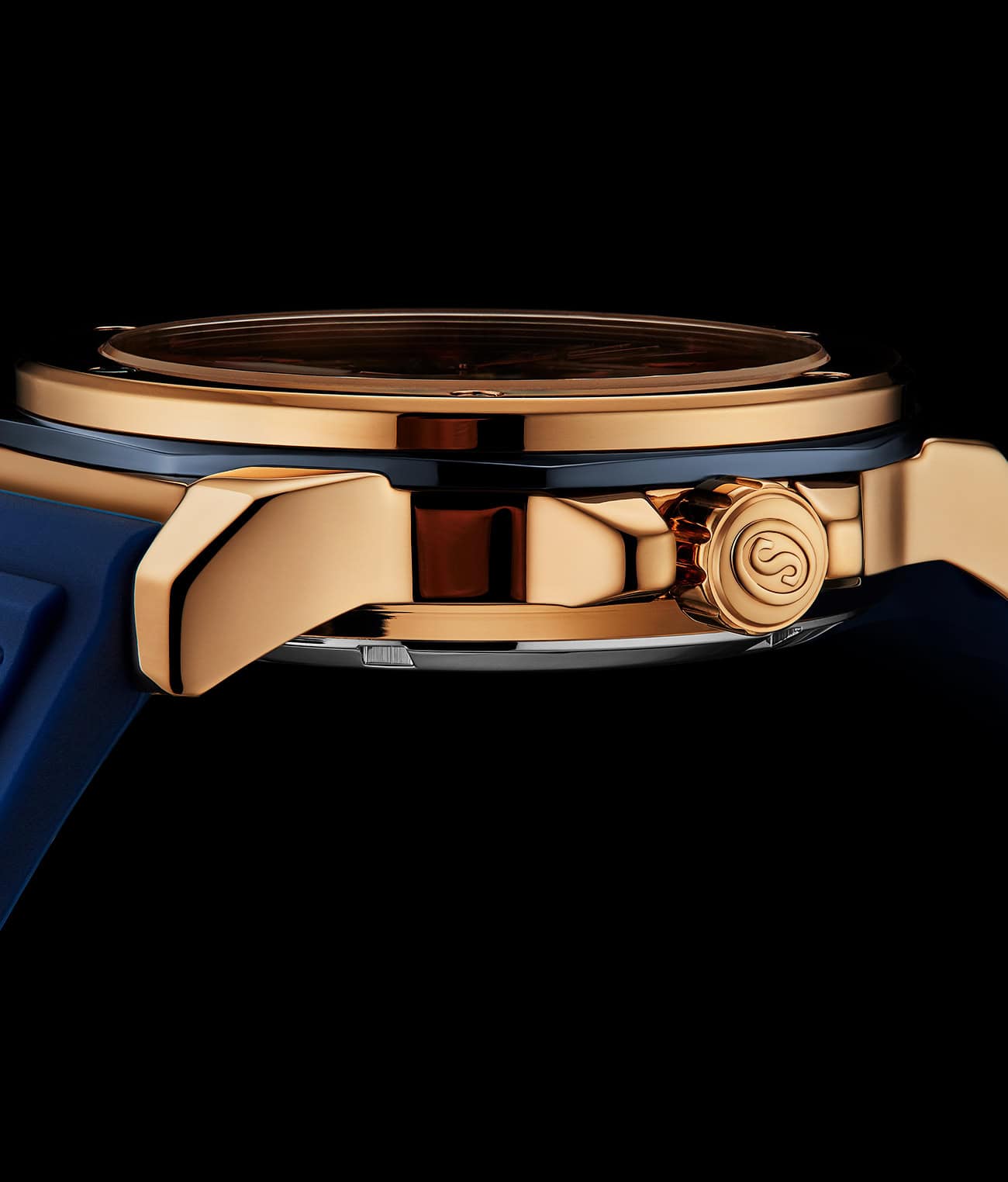 - העיצוב הפתוח מציע מבט מרתק לתוך המכניקה המורכבת של השעון, המציג את התנועה האוטומטית של 24 תכשיטים במלוא הדרו.