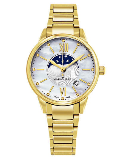 ה-Swiss Made 35MM Vassilis A204B משלב יוקרה עם פונקציונליות מתוחכמת. שעון נשים אלגנטי זה כולל מארז נירוסטה בגוון זהב צהוב 35 מ"מ, המציג לוח כסף יפהפה עם תצוגת שלב ירח שובת לב. מופעל על ידי תנועת רונדה 708 קוורץ האמינה, הוא מבטיח שמירת זמן מדויקת. החוגה מעוטרת במדדים עגולים מיושמים בנפרד ובידיים קשות, המוסיפות מגע של עידון. עם עובי מארז דק של 8 מ"מ, ה-Vassilis A204B מציע התאמה חלקה ונוחה. קריסטל הספיר העמיד בפני שריטות וצמיד הנירוסטה בעל 2 פלחים מספקים גם עמידות וגם סגנון. עמיד במים עד 5 ATM, שעון זה מושלם הן ללבוש יומיומי והן לאירועים מיוחדים.