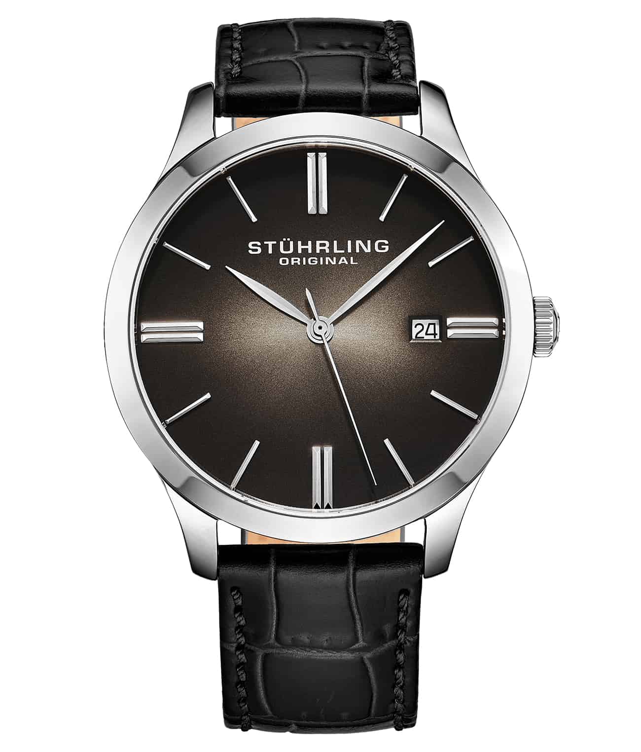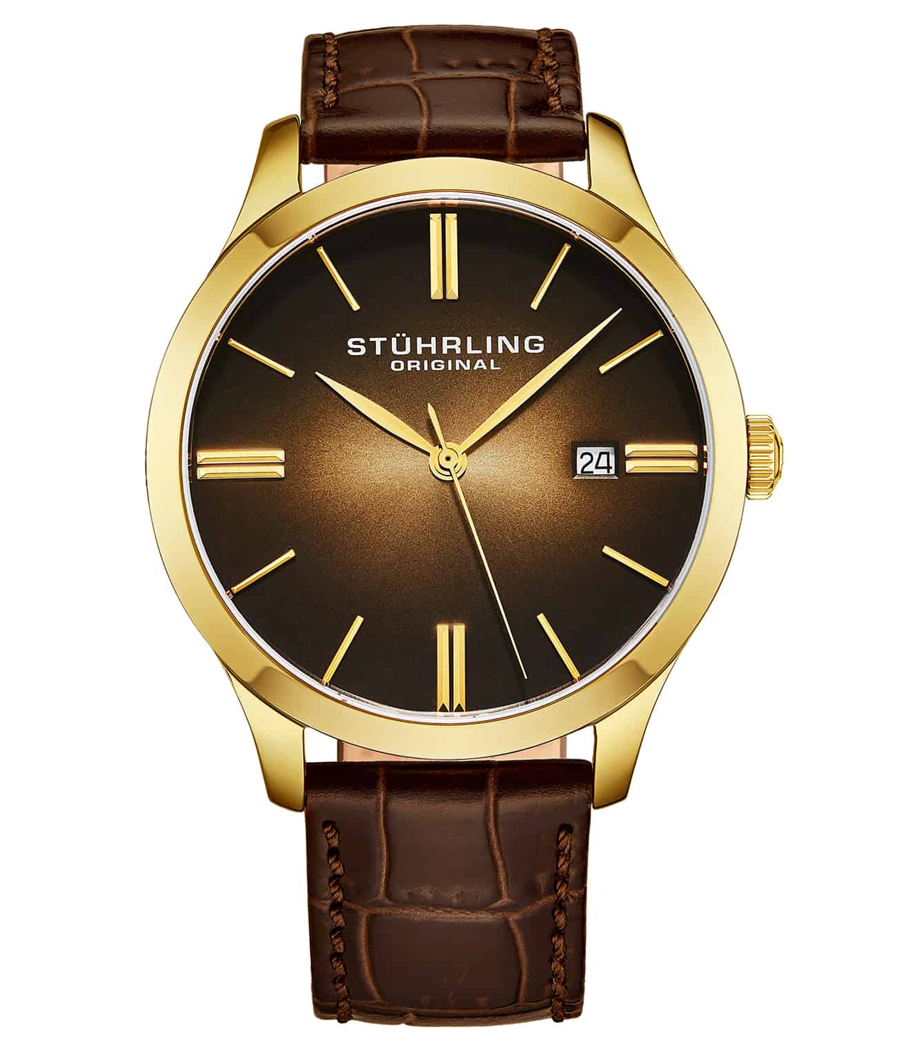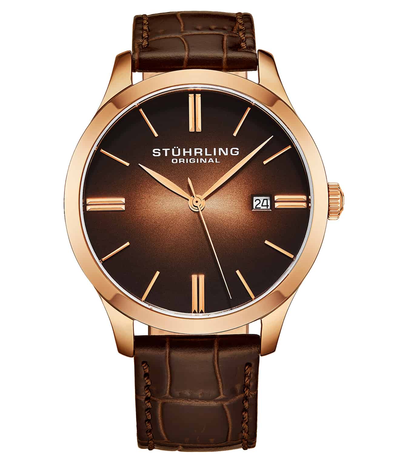 - תכונות נצחיות פוגשות את סגנון Stührling בידיים בסגנון עלים של Cuvette II 490, מדדי מקל מיושמים בנפרד, וחוגה לגימור שמש.