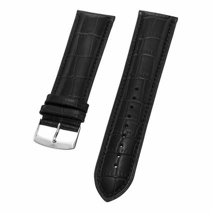 24 mm Black Leather Replacement Strap with a Steel Tang buckle. This is a direct replacement for Stuhrling model 165XL.