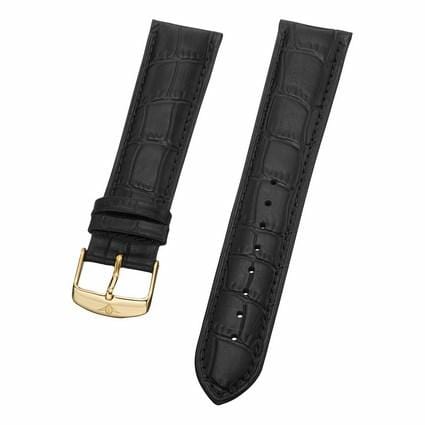 22 mm Black Leather Replacement Strap with a Yellow Gold Tang buckle. This is a direct replacement for Stuhrling model 50D.