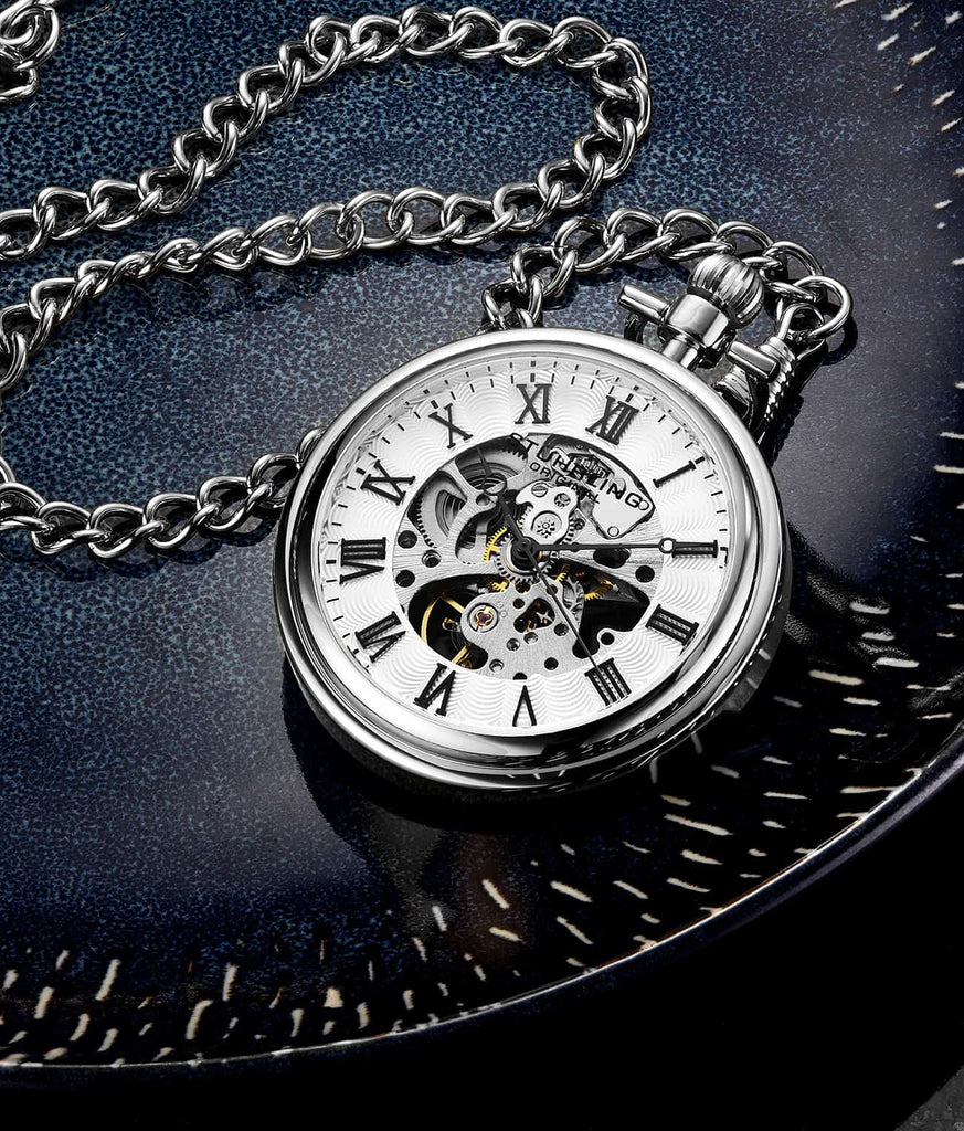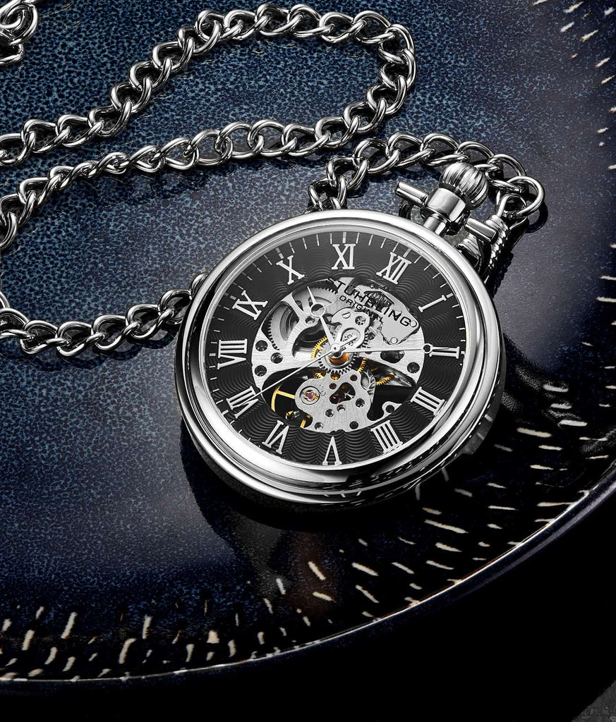 This pocket watch is an embodiment of classical watchmaking with a modern twist. The 48mm case provides a substantial yet elegant size, ideal for a discerning collector or as a statement piece. The skeletonized dial reveals the intricate hand-wind movement, marrying the nostalgia of traditional timekeeping with the fascination of modern mechanics. Roman numerals add a timeless touch, while the fixed polished bezel encircles the dial with a lustrous sheen. A sturdy stainless steel chain completes the piece, ensuring secure carrying and an added touch of style.