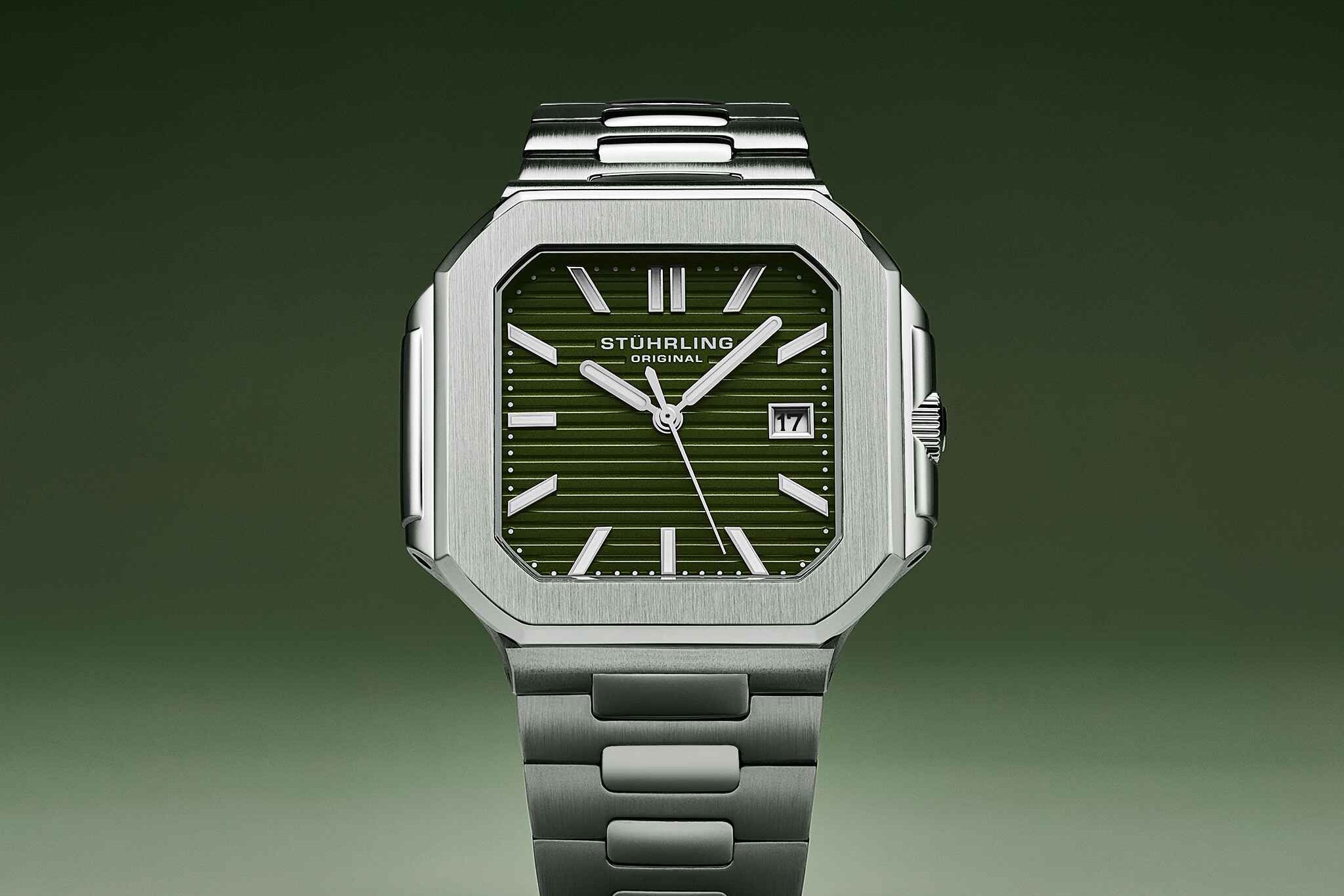 | Model Story: | Structured for precision and designed for the modern wrist, the Modulus 4064 delivers everyday utility through clean geometry and quartz-powered confidence. Its 44mm square brushed case with a slim 10mm profile meets an integrated stainless steel bracelet in a seamless silhouette inspired by architectural symmetry. The sunray dial—available in black, green, or blue—features polished baton markers and a framed date window, anchored beneath a flat mineral crystal. Luminous hands and indices add visibility, while the signed crown and engraved caseback complete the look with functional elegance. Backed by a reliable quartz movement, the Modulus is built for those who value structure, clarity, and effortless timekeeping. Its slim build and integrated design make it ideal for both weekday wear and elevated casual style—perfect under a shirt cuff or paired with minimalist fashion. The 5 ATM water resistance provides everyday protection against splashes, rain, and surface swimming, but is not recommended for diving, snorkeling, or high-impact water sports.