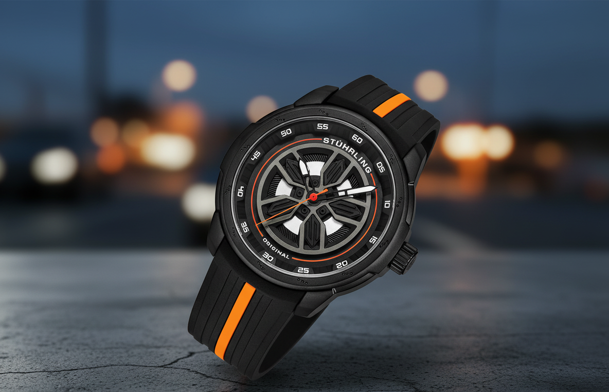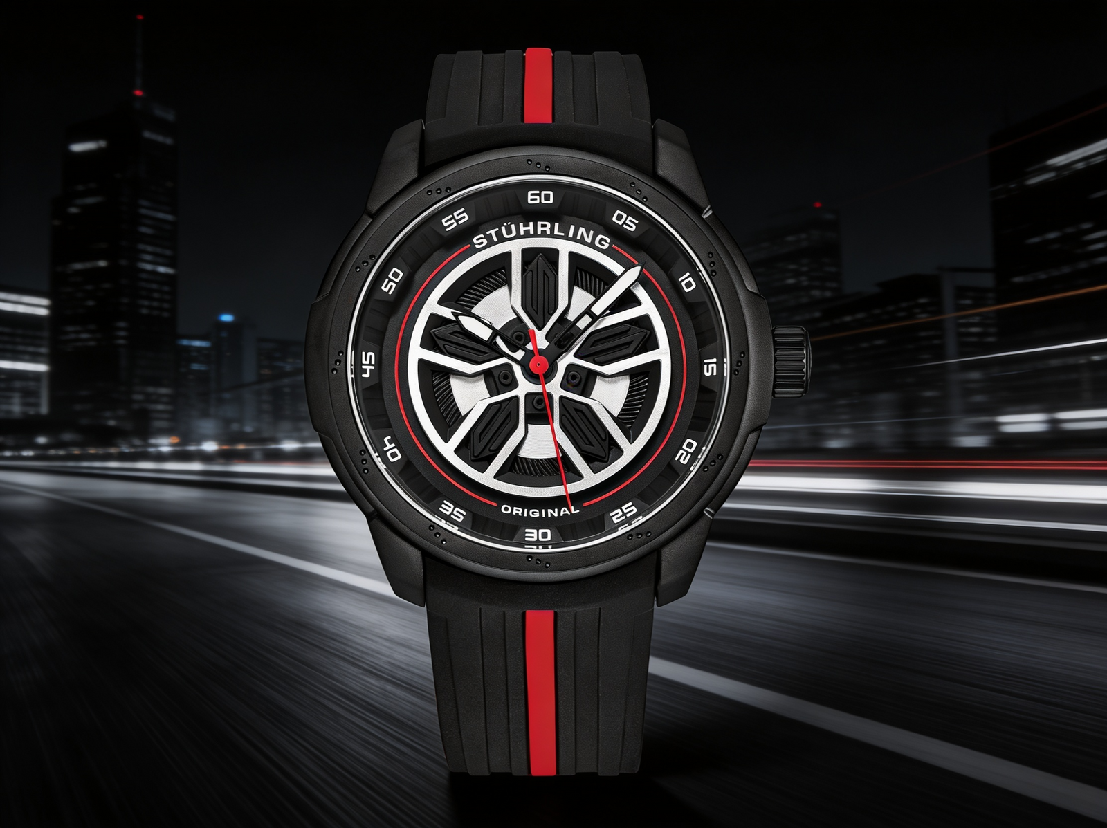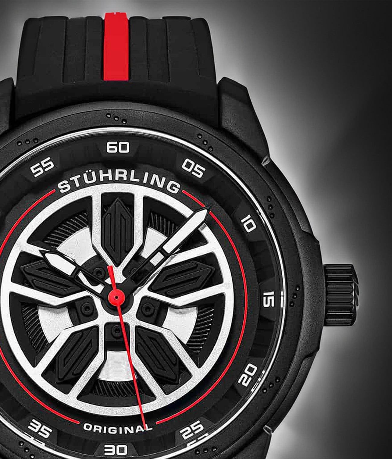 This 44mm watch strikes an assertive profile with its unique design inspired by automotive excellence. The fixed bezel is decorated with a brake rotor motif that speaks to the spirit of speed and precision. It's paired with a 22mm wide rubber strap, distinguished by a color stripe that adds a dynamic visual element while ensuring comfort and resilience on the wrist.