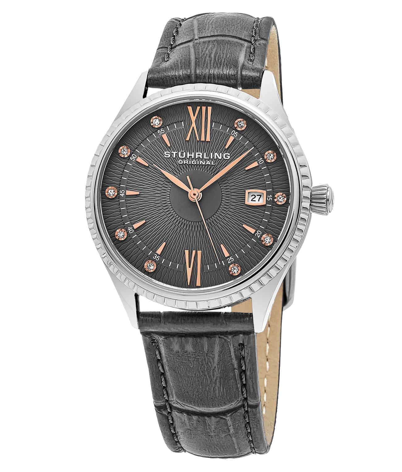 Brushed finish Guilloché design dial with date window at 3:00