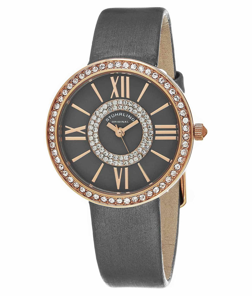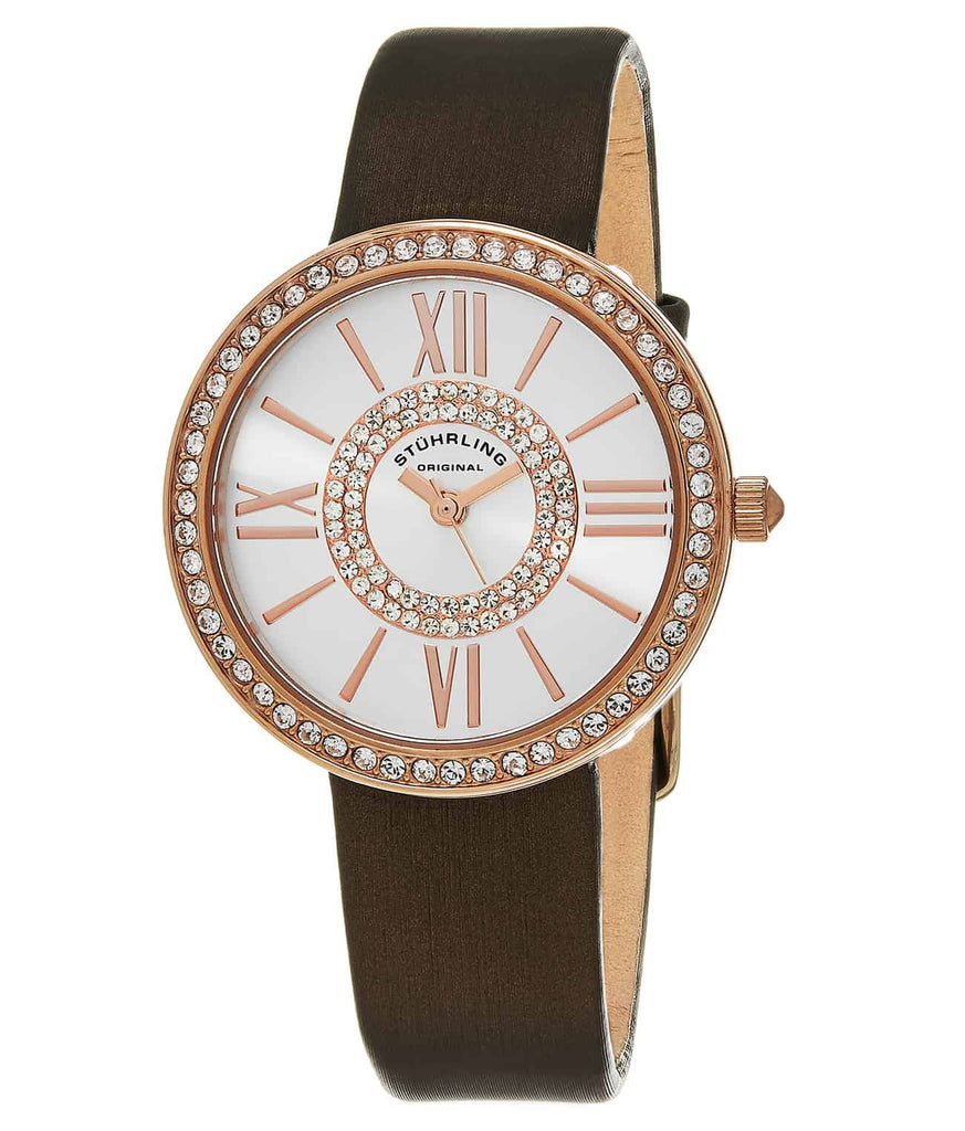 This Stührling Original Chic 566 Quartz watch features a 34mm case with a polished, crystal-filled bezel. The dial showcases Roman numeral hour markers and an inner ring of crystals. It has a satin-covered genuine leather strap (16mm wide) and is water-resistant up to 5 ATM (50 meters/165 feet). The precision quartz movement ensures accurate timekeeping.