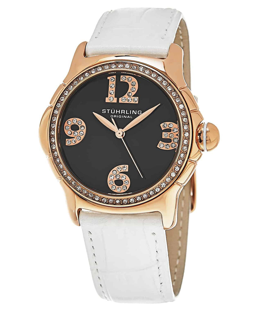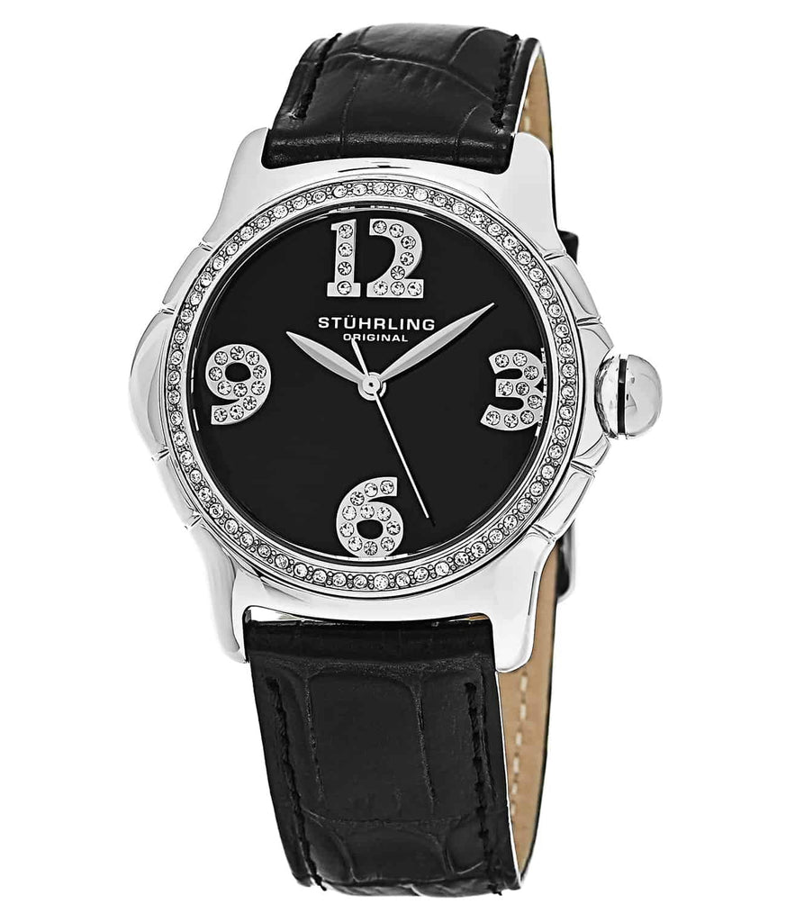 This Stührling Original watch features a 38mm stainless steel case with a crystal-filled bezel and a dial with crystal-studded numerals. It has an alligator-embossed genuine leather strap and is water-resistant up to 5 ATM (50 meters/165 feet). The precision quartz movement ensures accurate timekeeping.