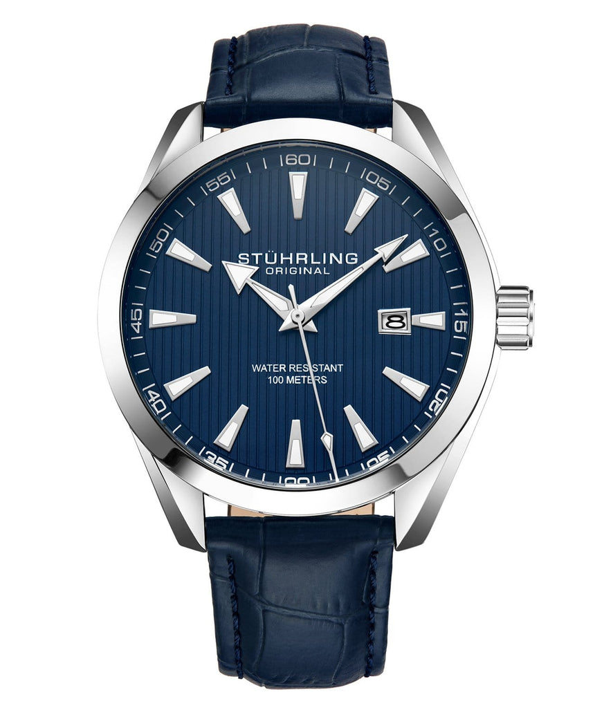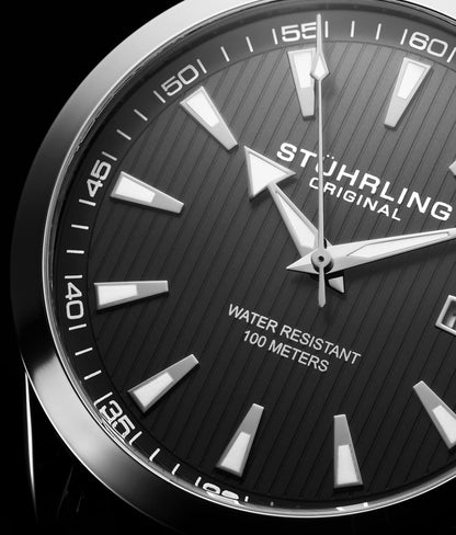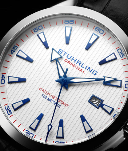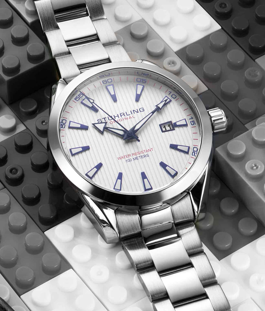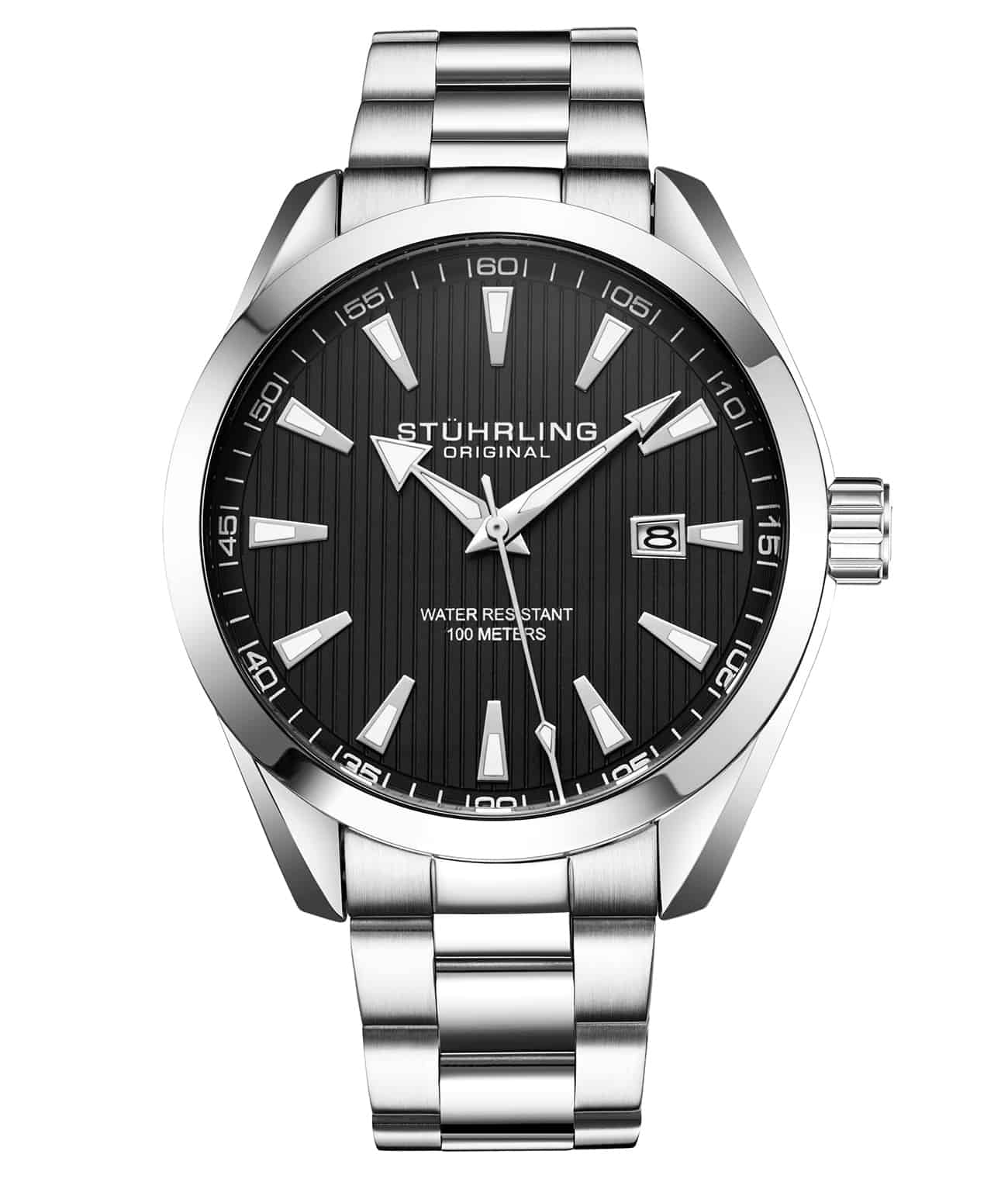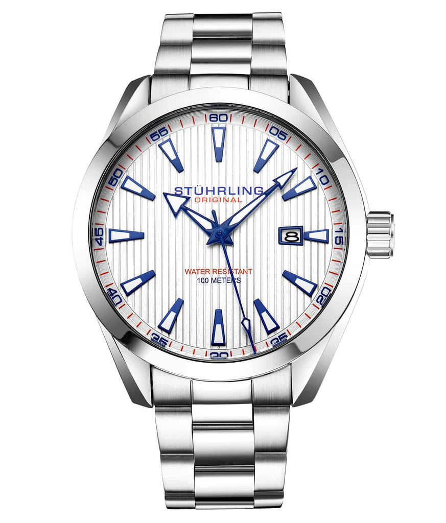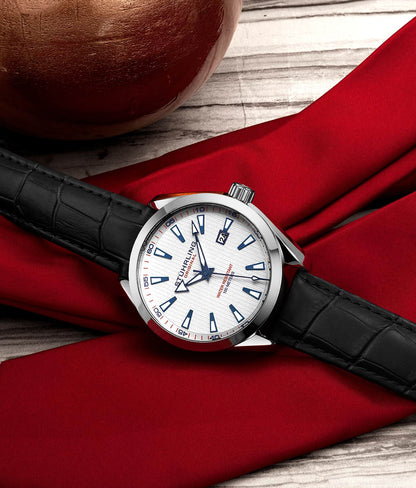 This watch exudes a modern elegance with its sleek stainless steel bracelet and clean white dial. The dial is adorned with accented hands and hour markers, offering a sophisticated contrast that's both bold and readable. The watch’s design is functional yet stylish, suitable for both professional settings and casual occasions.