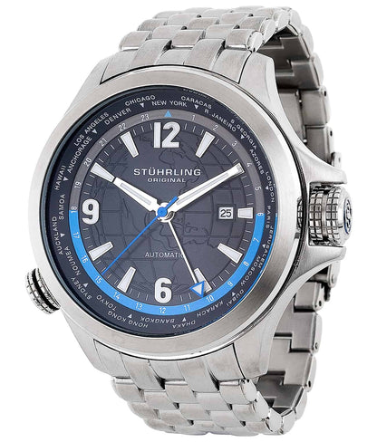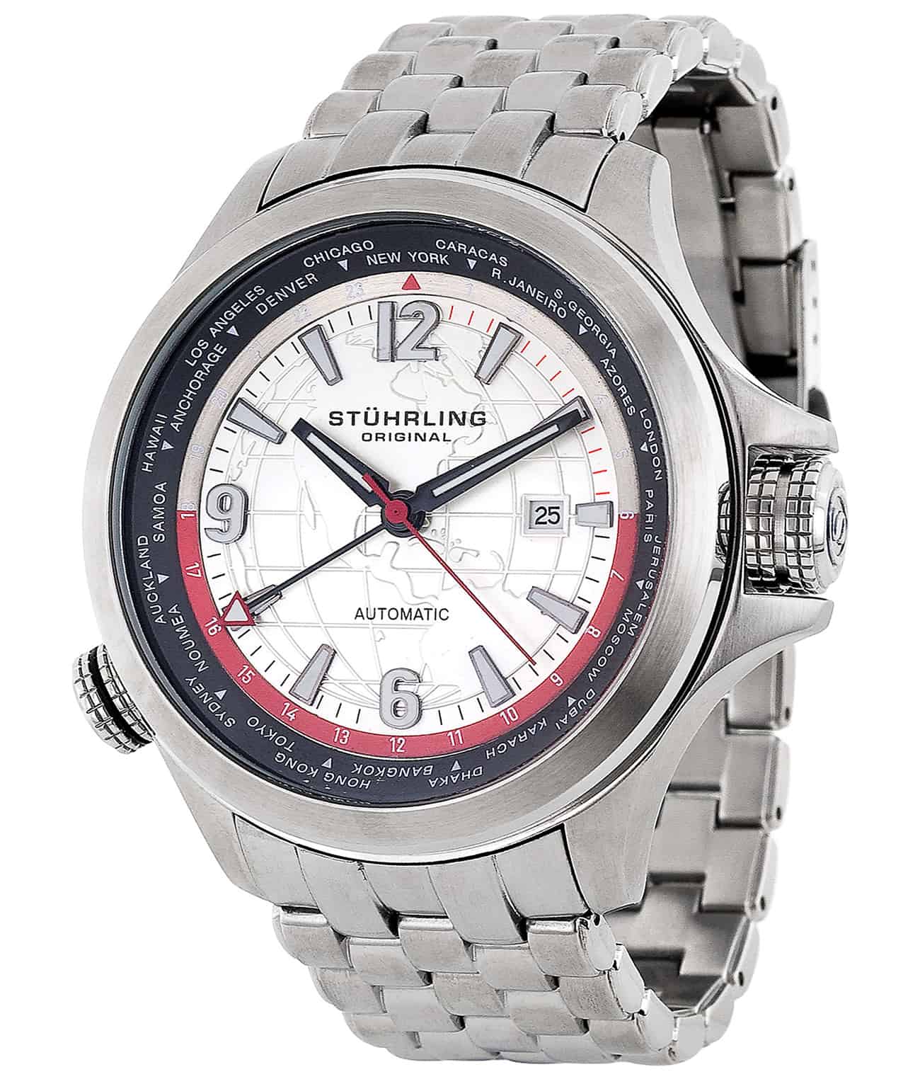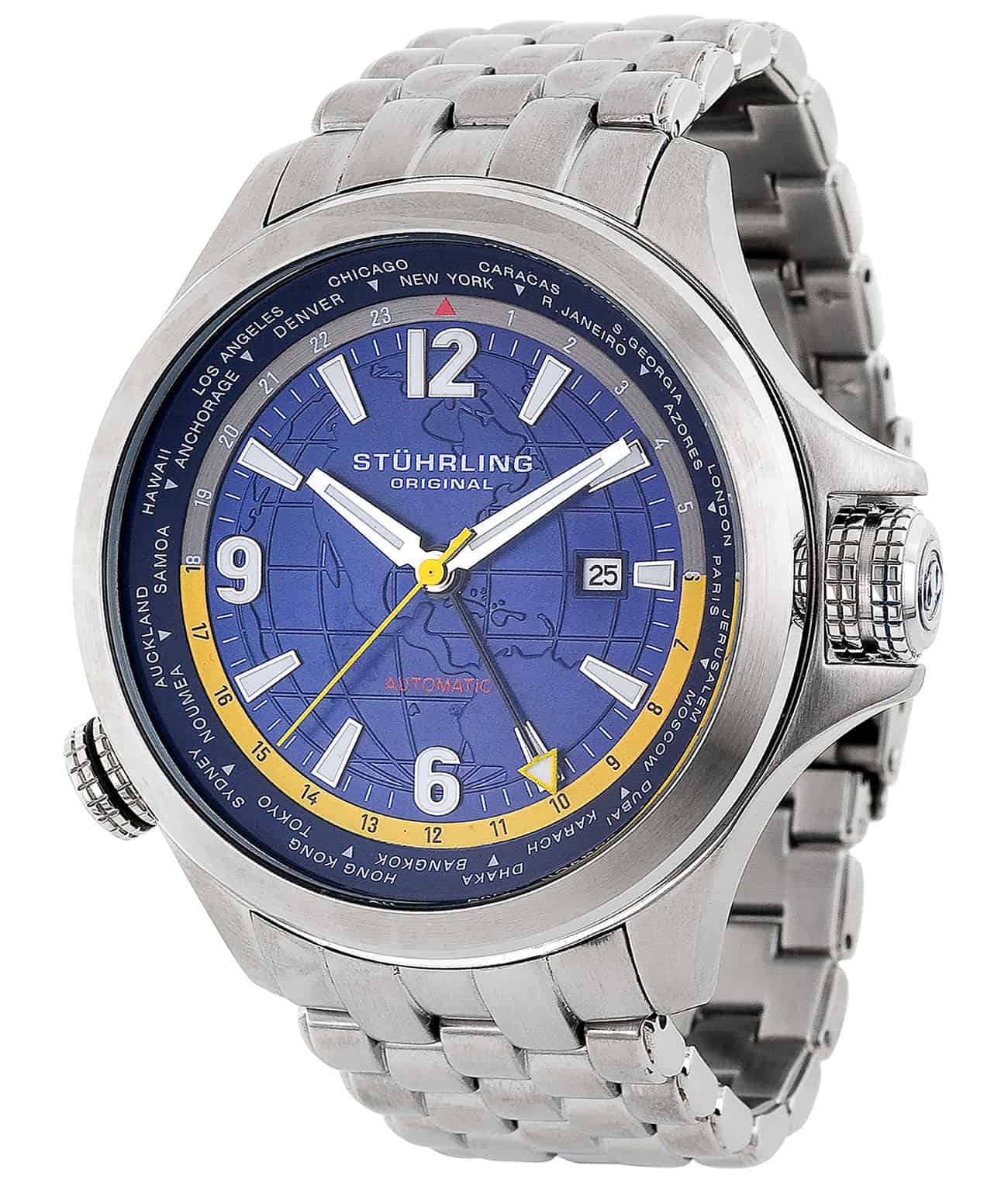 This Stuhrling original is a gorgeous time piece! It has a separate crown to set the country on the inside and a separate hand with an arrow tip to indicate the hour in that country. The luminova indices and hands show up beautifully after dark. Love love love the bracelet on this watch! Not too heavy and very comfortable. Great watch overall