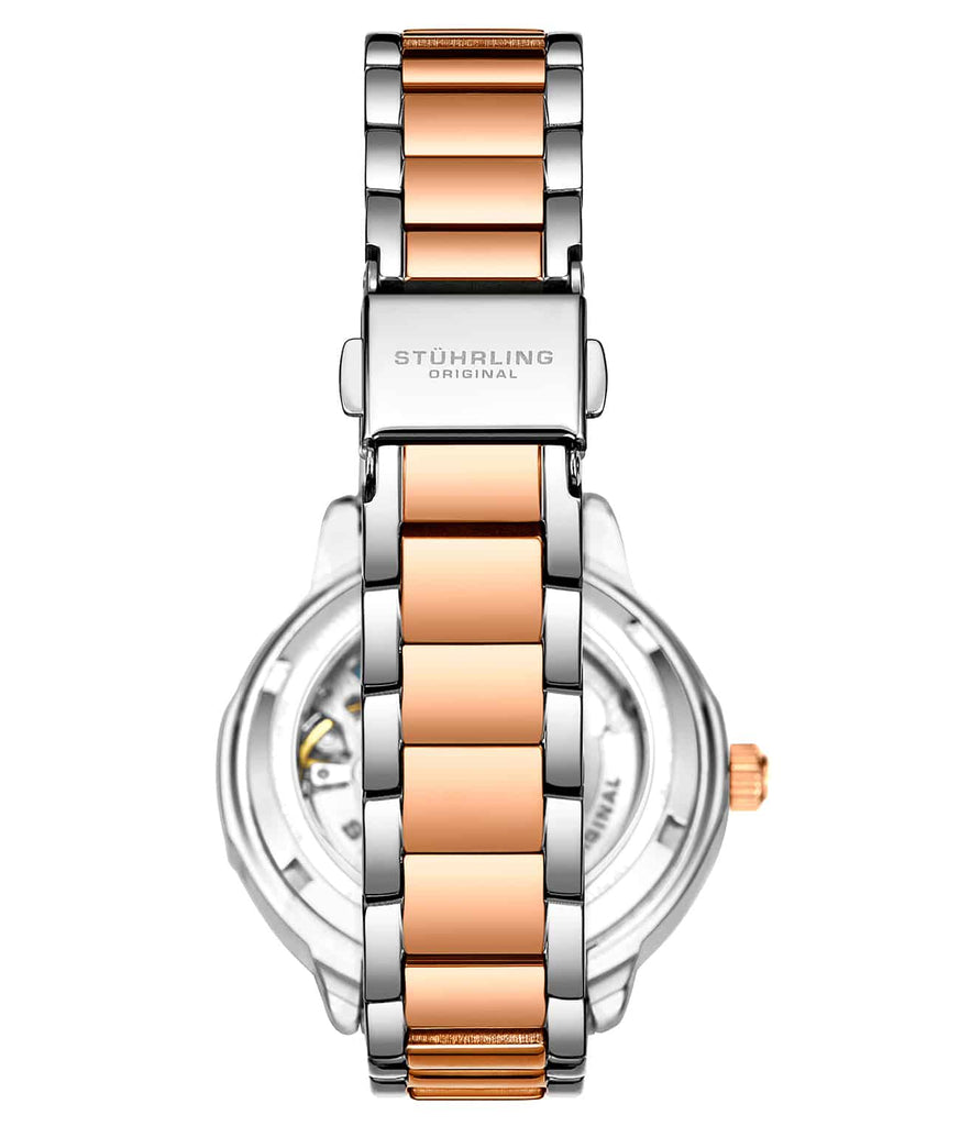 This timepiece captivates with a 36mm case and a crystal-studded bezel, adding a touch of luxury to the skeletal display that reveals the intricate workings beneath. Roman numerals add a classic elegance to the design, while the 5 ATM water resistance offers practicality. The sleek link bracelet, 16mm wide, ensures a refined fit for all-day sophistication.