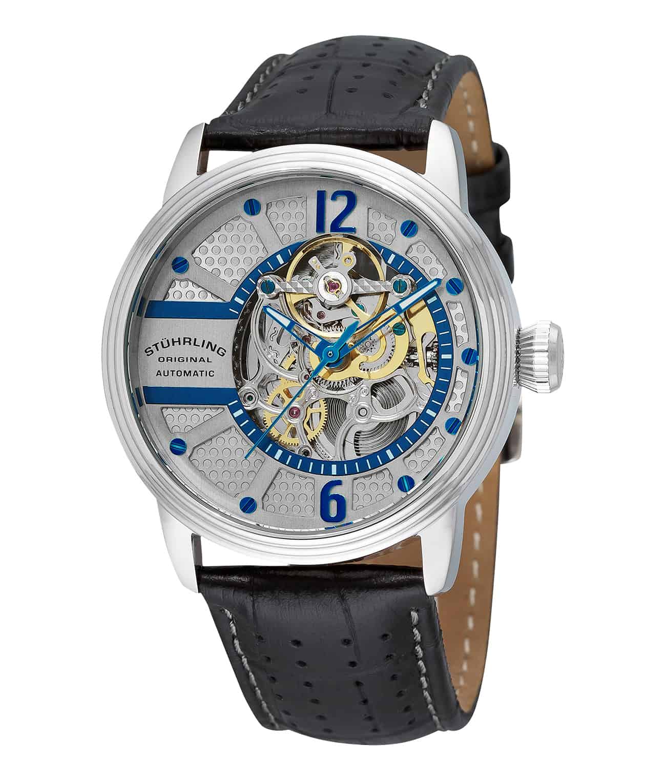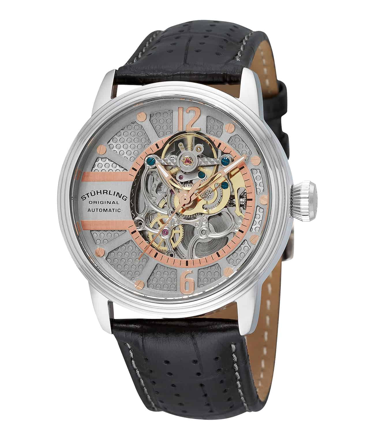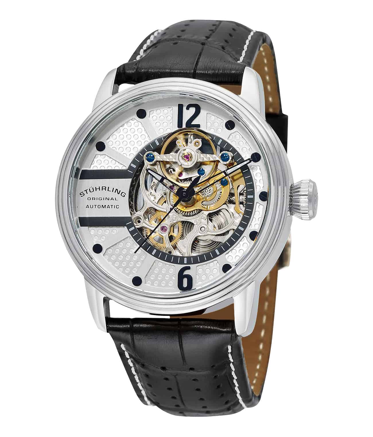 - Skeletonized baton style hands with luminous tips keep your time easily legible and strikingly original.