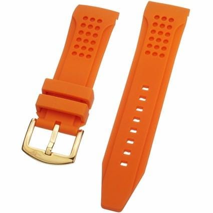 24 mm Orange Rubber Replacement Strap with a Yellow Gold Tang buckle. This is a direct replacement for Stuhrling model 1070.
