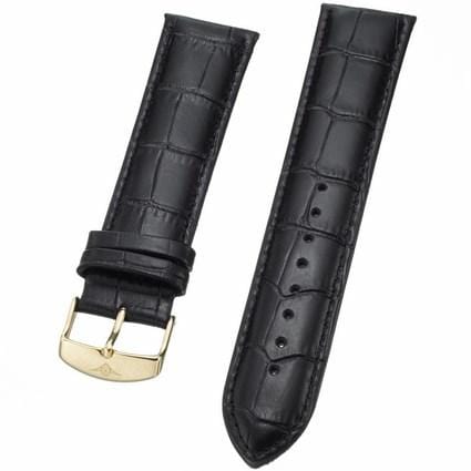 24 mm Black Leather Replacement Strap with a Yellow Gold Tang buckle. This is a direct replacement for Stuhrling model 1077.