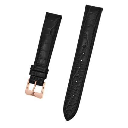18 mm Black Leather Replacement Strap with a Rose Gold Tang buckle. Stuhrling model 365.