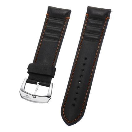 23 mm Black Leather Replacement Strap with a Steel Tang buckle. This is a direct replacement for Stuhrling model 4ATC.