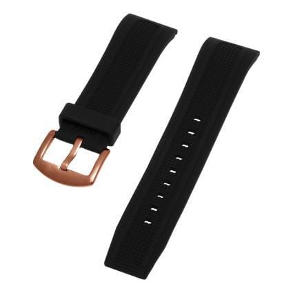 24 mm Black Rubber Replacement Strap with a Rose Gold Tang buckle.