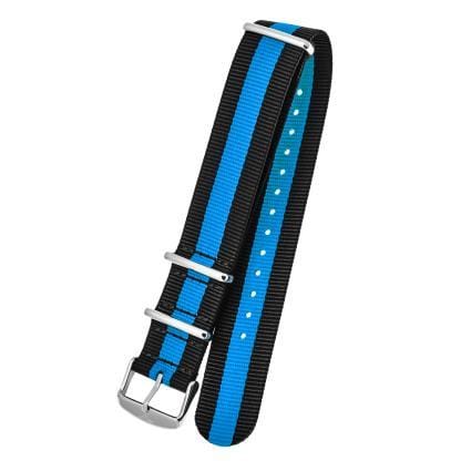 22 mm Black/blue Canvas Replacement Strap with a Steel Tang buckle. This is a direct replacement for Stuhrling model 522.