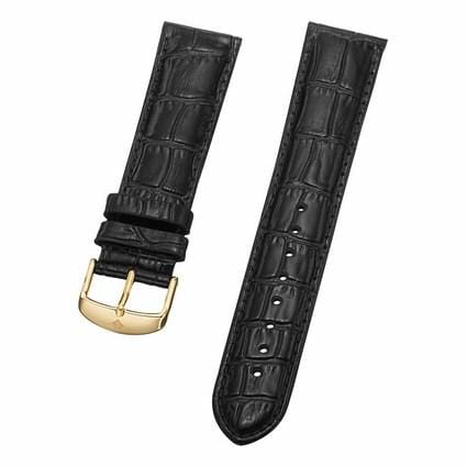 22 mm Black Leather Replacement Strap with a Yellow Gold Tang buckle. This is a direct replacement for Stuhrling model 585.