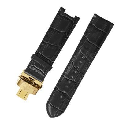 24 mm Black Leather Replacement Strap with a Yellow Gold Deployant buckle. This is a direct replacement for Stuhrling model 627.