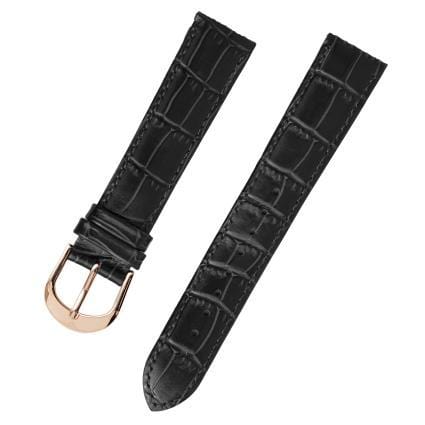 16 mm Black Leather Replacement Strap with a Rose Gold Tang buckle.