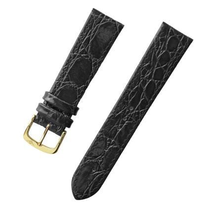 20 mm Black Leather Replacement Strap with a Yellow Gold Tang buckle. This is a direct replacement for Stuhrling model 682.
