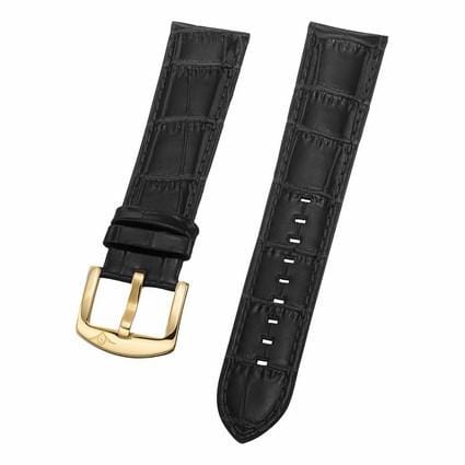 22 mm Black Leather Replacement Strap with a Yellow Gold Tang buckle. This is a direct replacement for Stuhrling model 717.