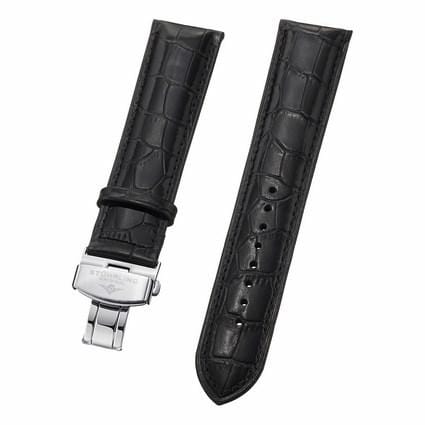 22 mm Black Leather Replacement Strap with a Steel Deployant buckle. This is a direct replacement for Stuhrling model 97BB.