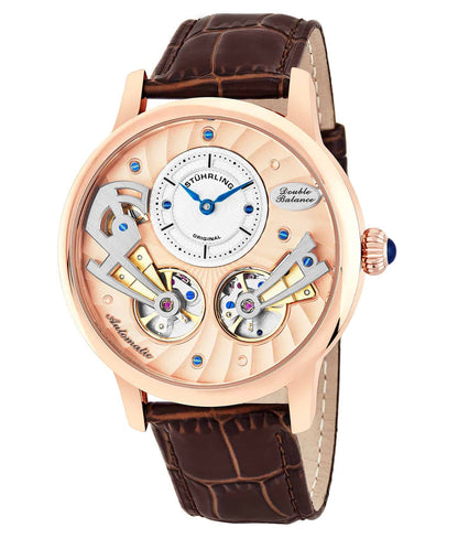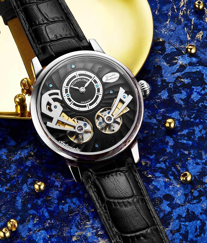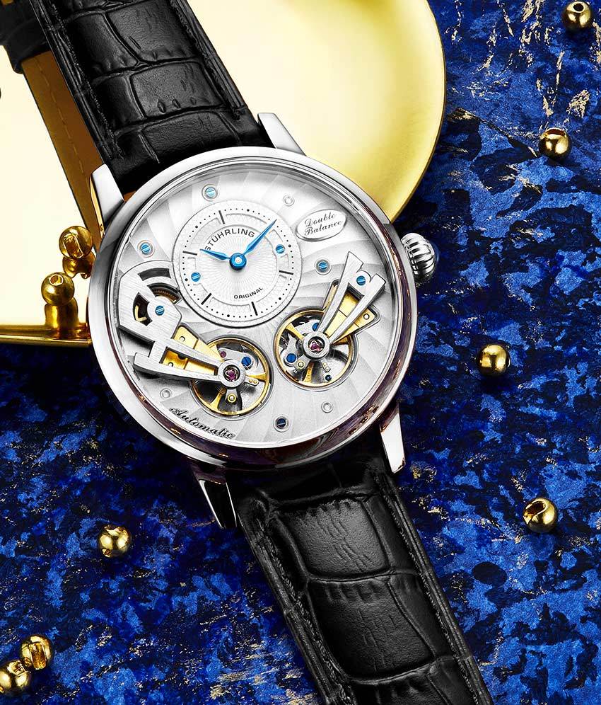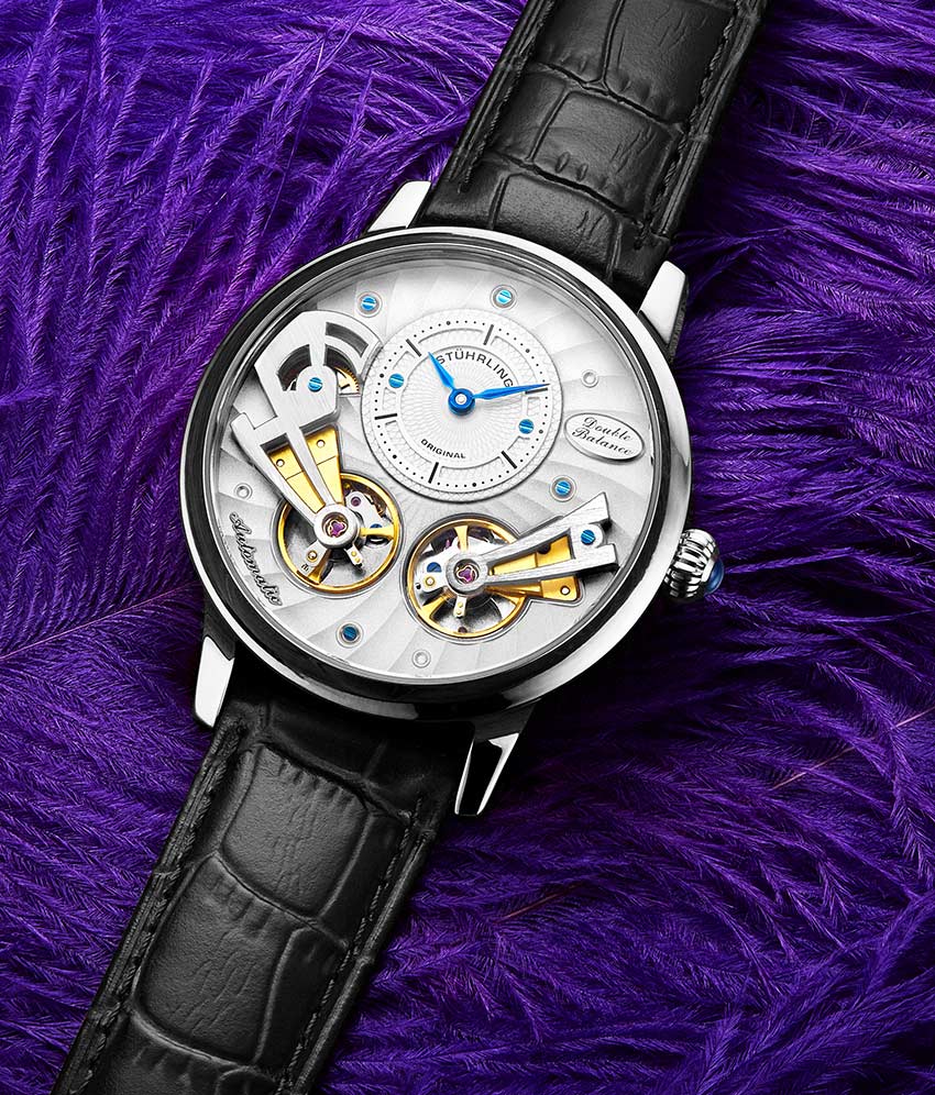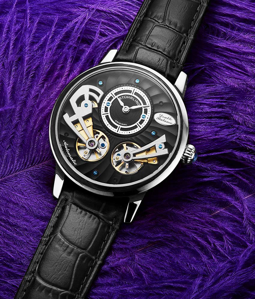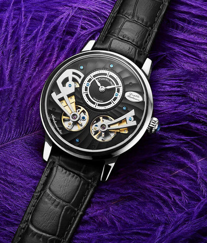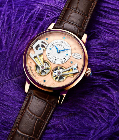 Guilloche center dial on a swirl design outer dial with dual open heart balance wheels