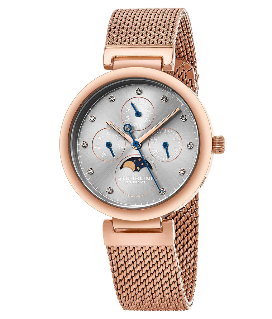 Smooth dial with four subdials: Month at 12:00, Date at 3:00, Moon phase at 6:00 and Day at 9:00
