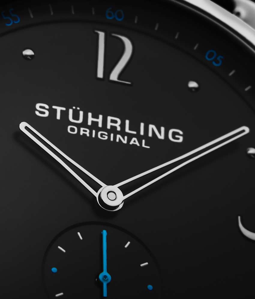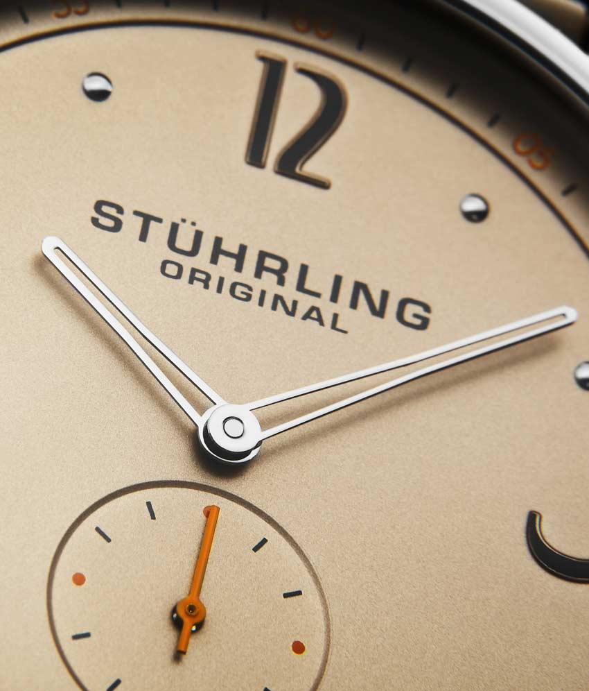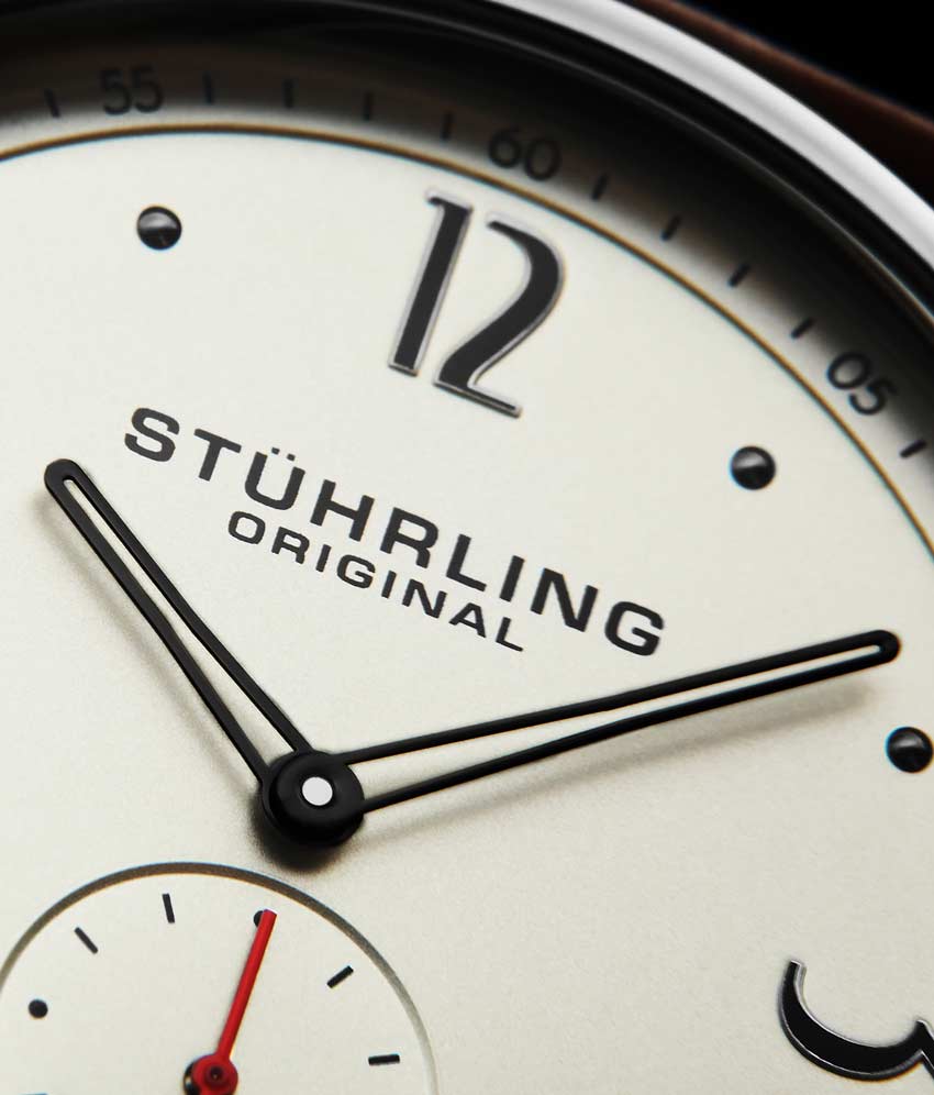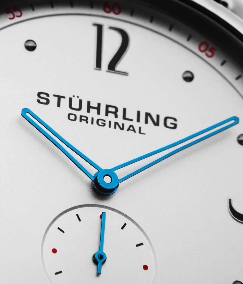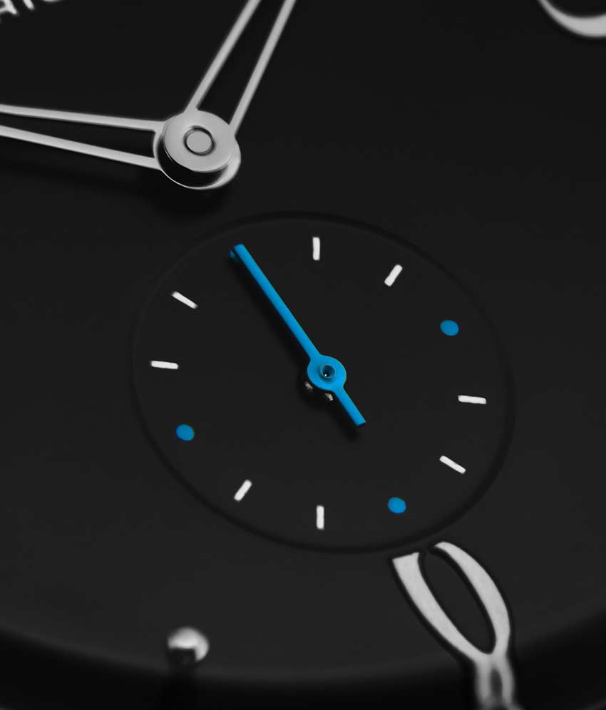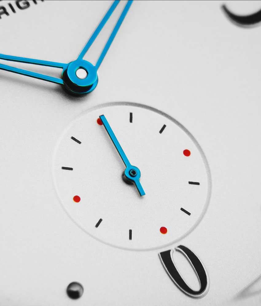 Brushed finish dial with seconds subdial at 6:00 and minutes track on outer ring
