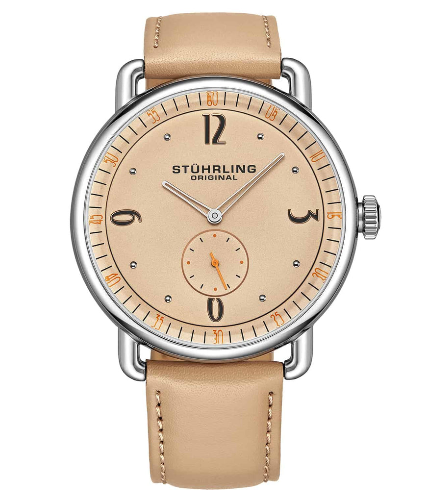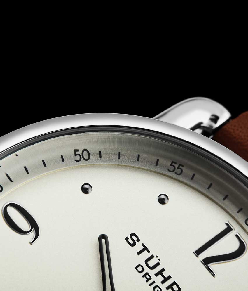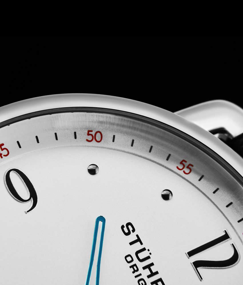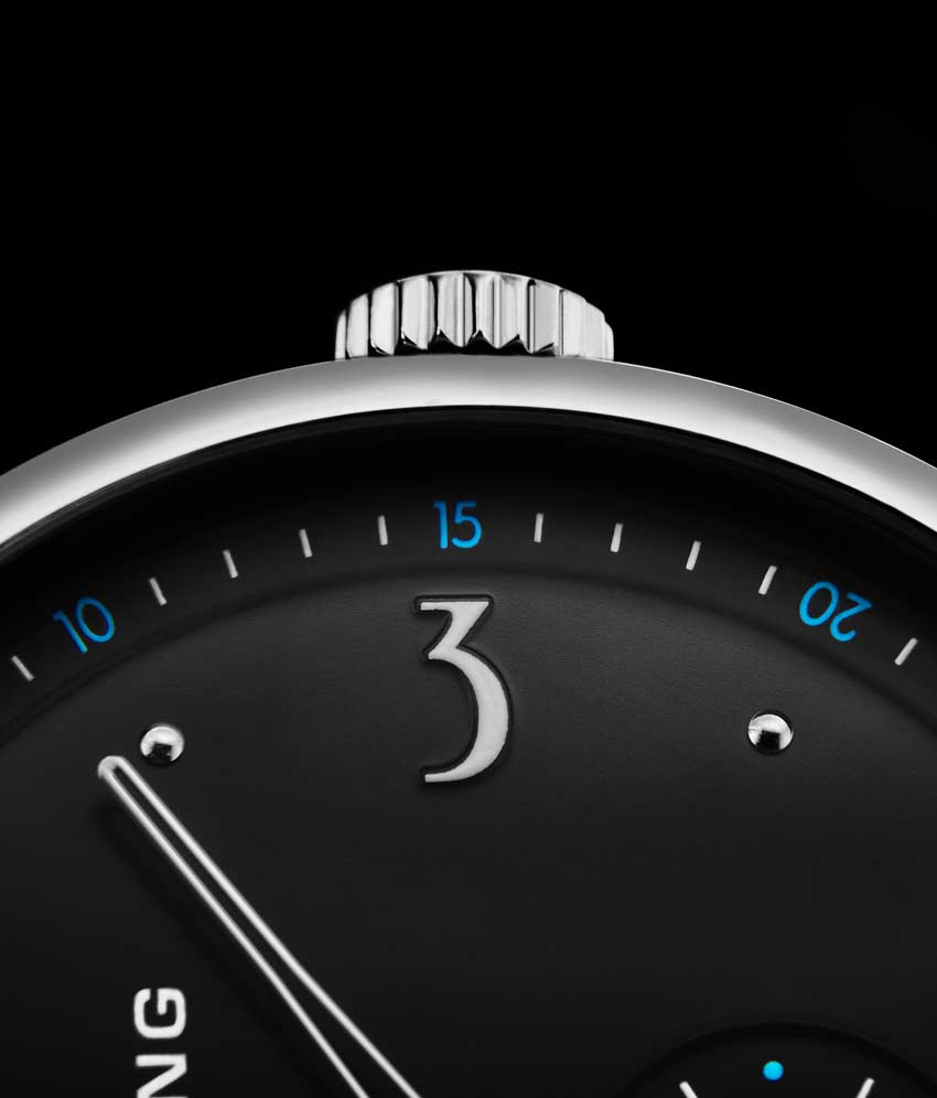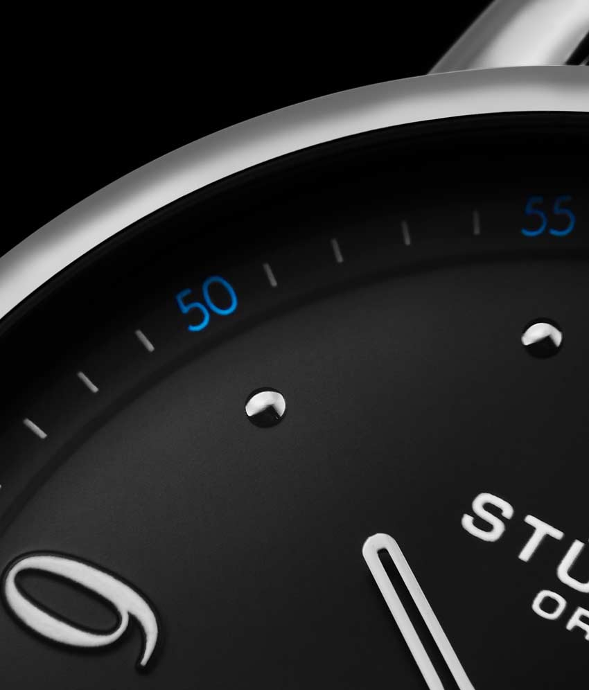 Brushed finish dial with seconds subdial at 6:00 and minutes track on outer ring