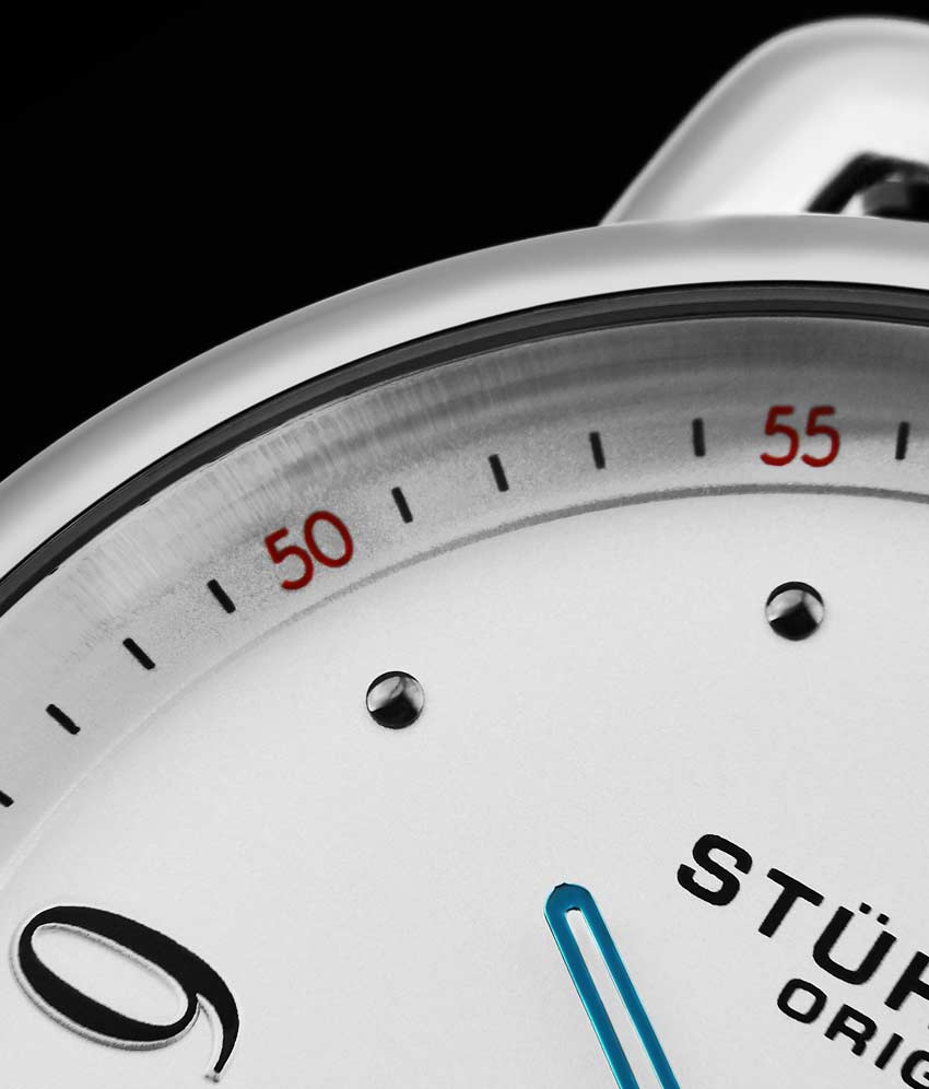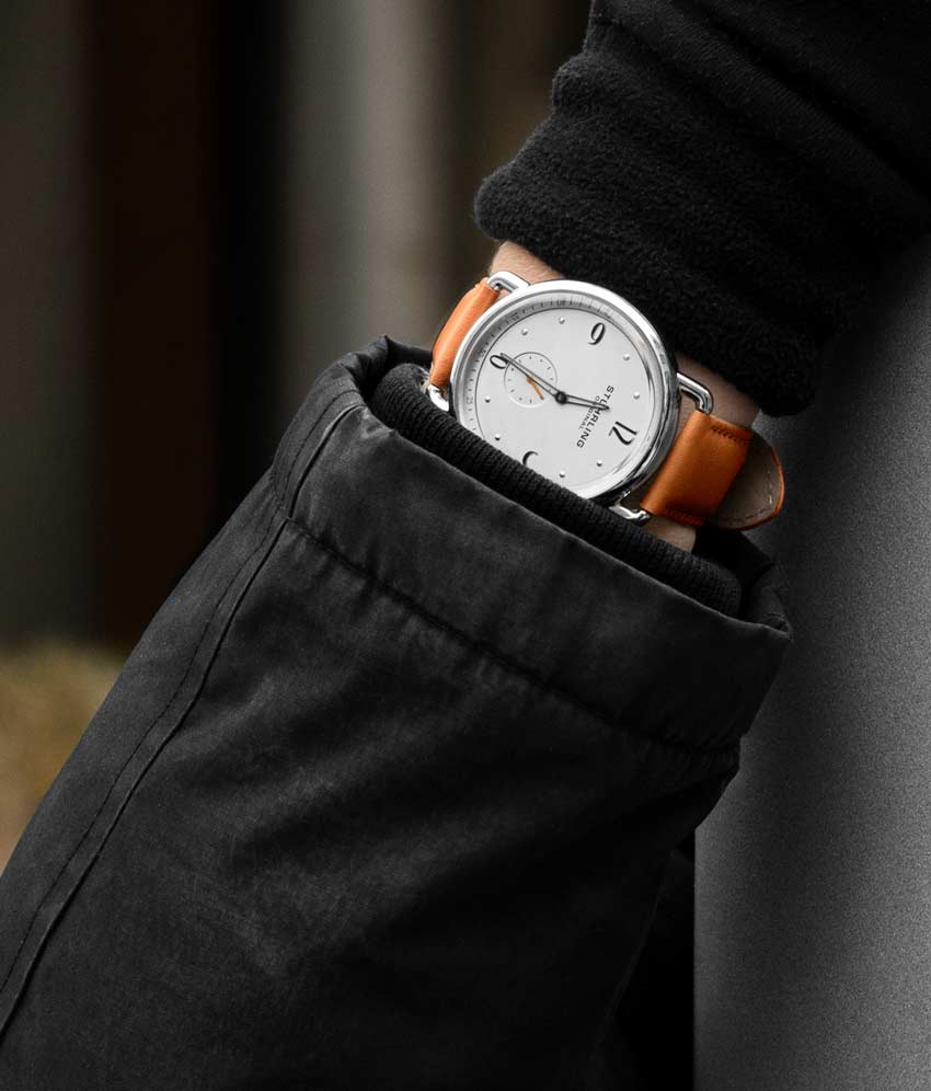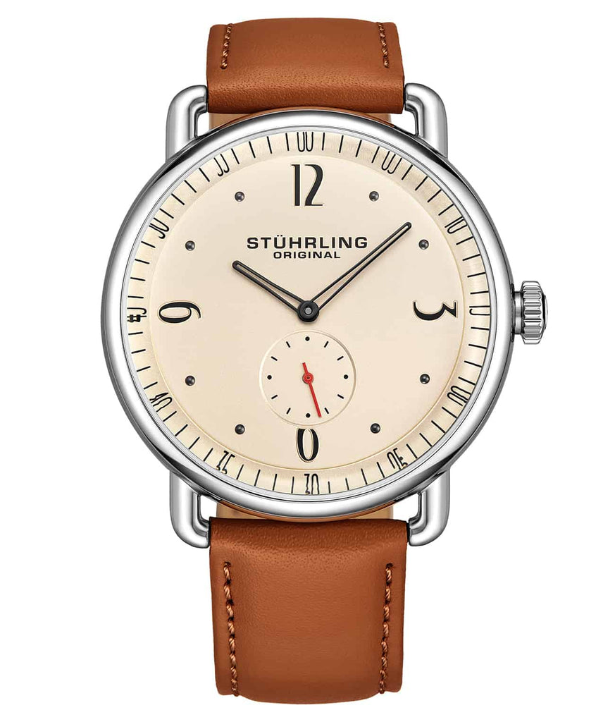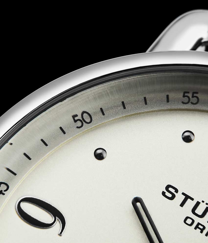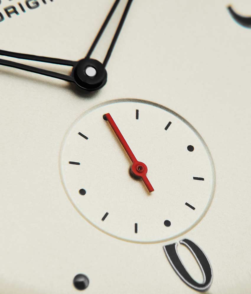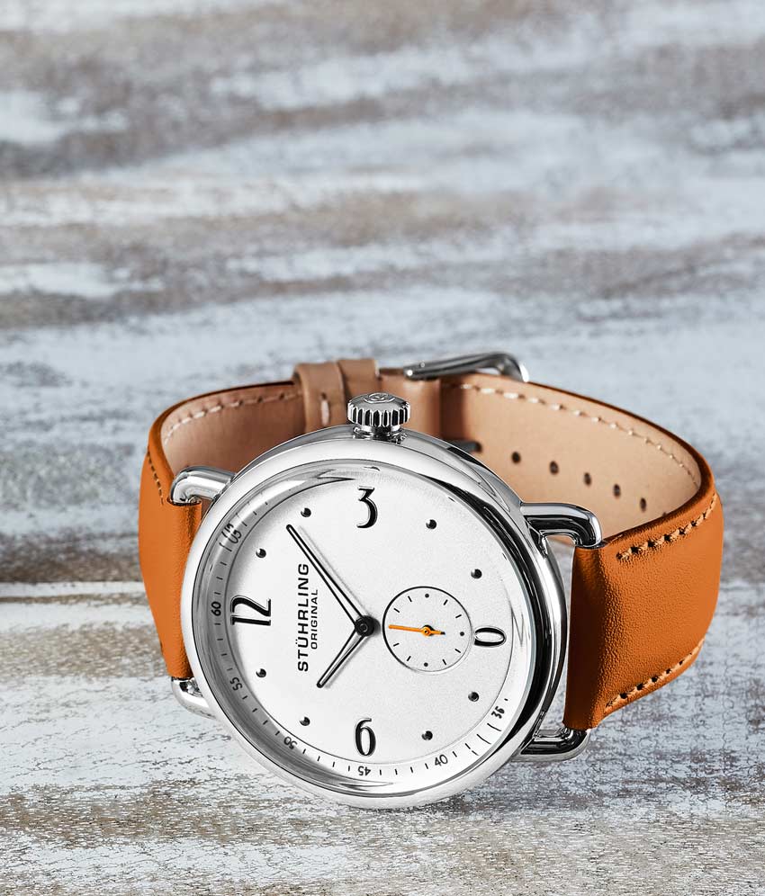 Brushed finish dial with seconds subdial at 6:00 and minutes track on outer ring