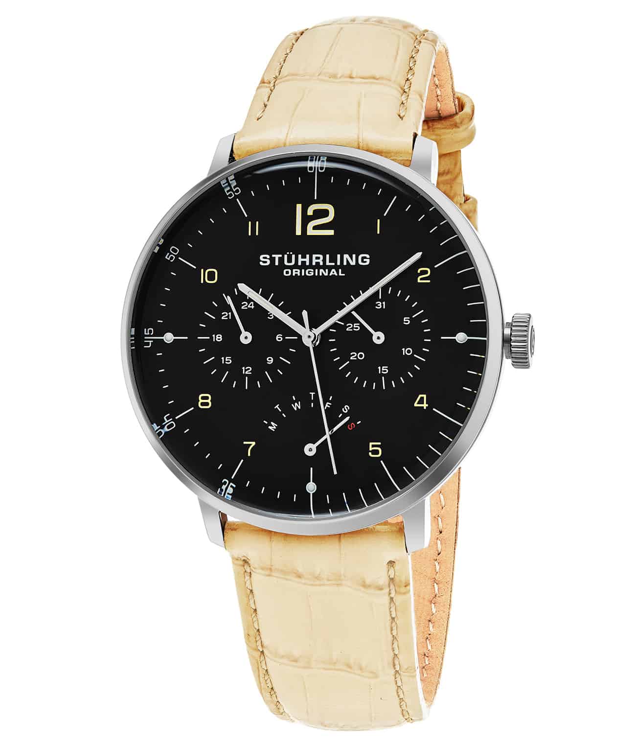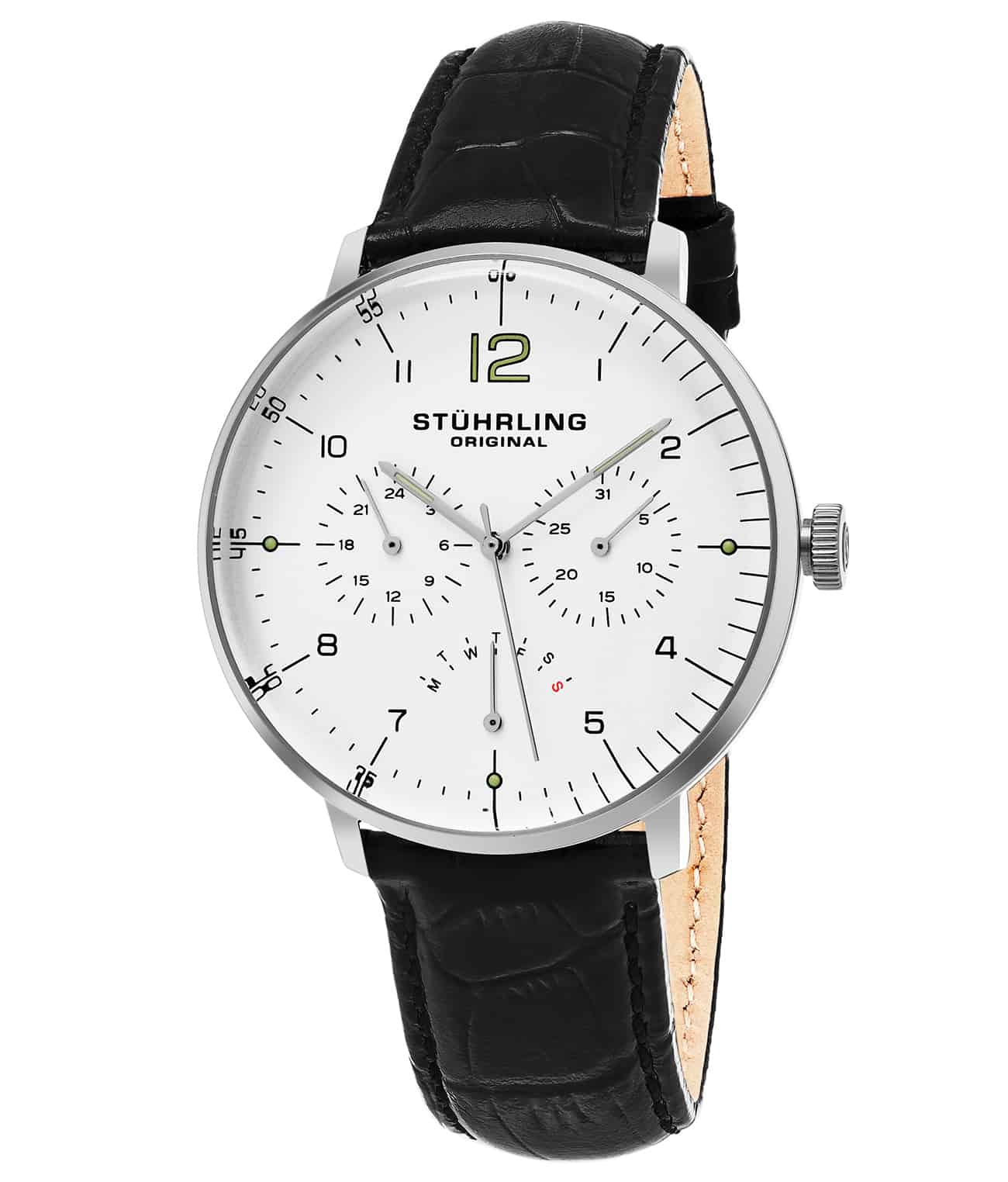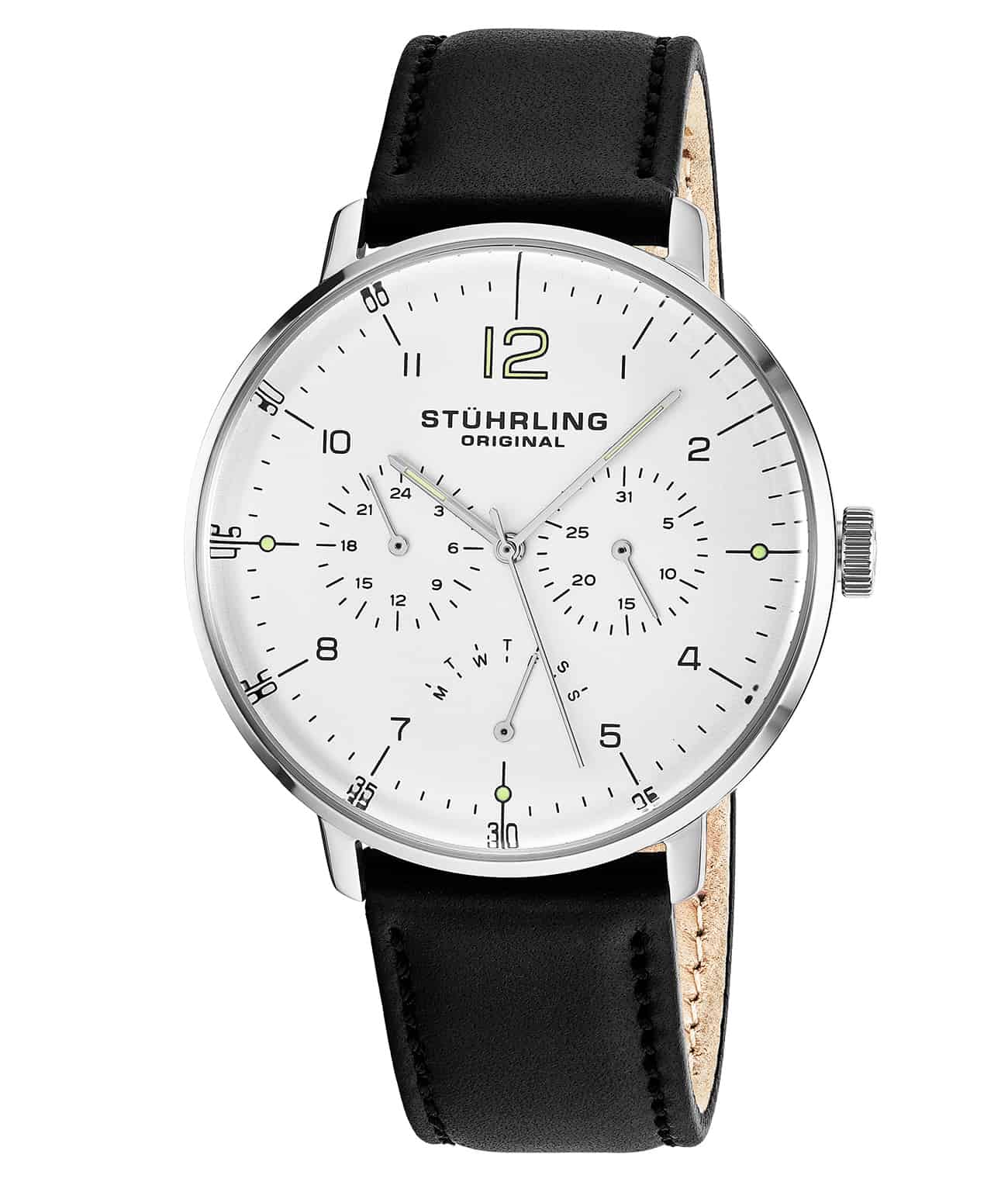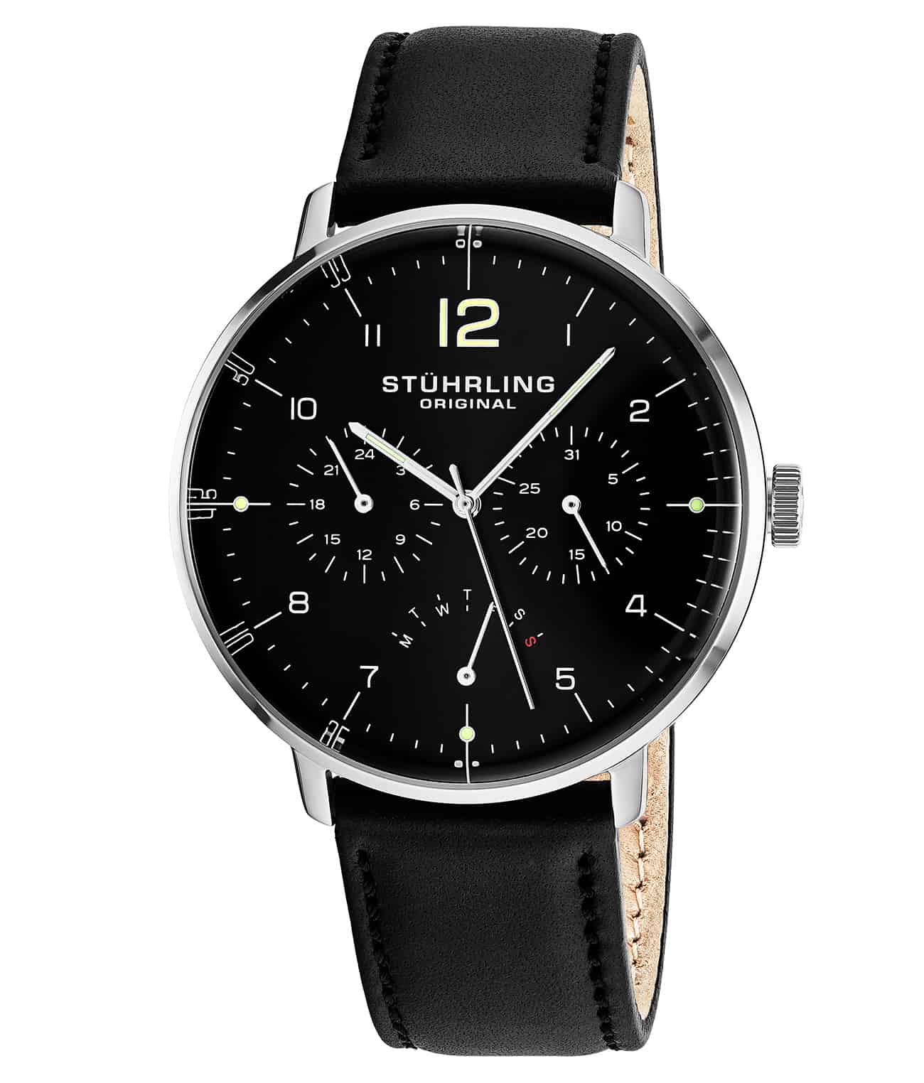 Brushed finish dial with subdials for day, date and 24 hour indicator